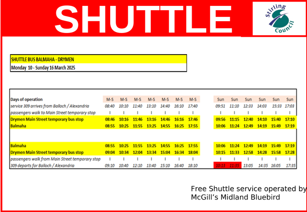 Below is the shuttled timetables provided by Stirling Council and operated on behalf of McGill's Midland Bluebird.
